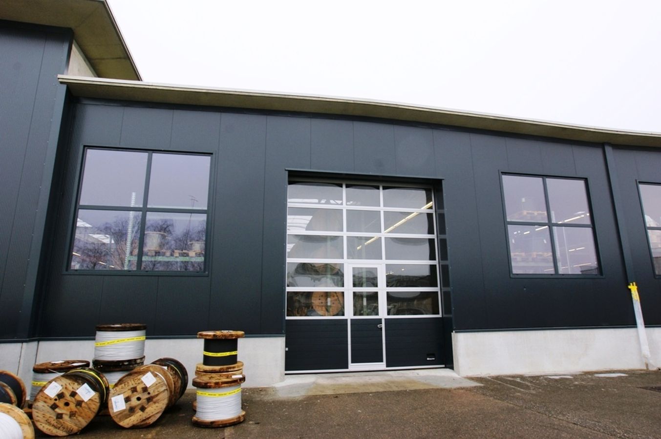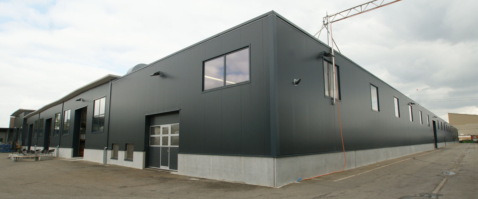 Sanierung der Fassaden inklusive Fenster und Oblichter, sowie Ersetzen der Sektionaltore. Erstellen eines überdachten Containerplatzes mit Sichtschutzpaneelen.
