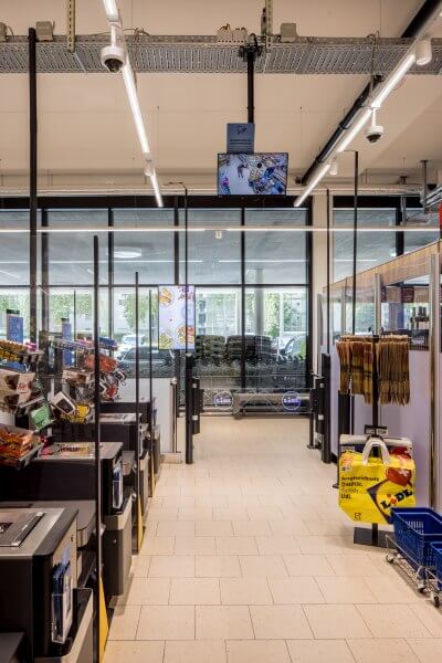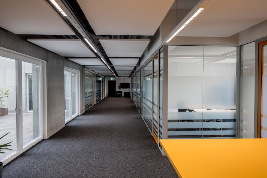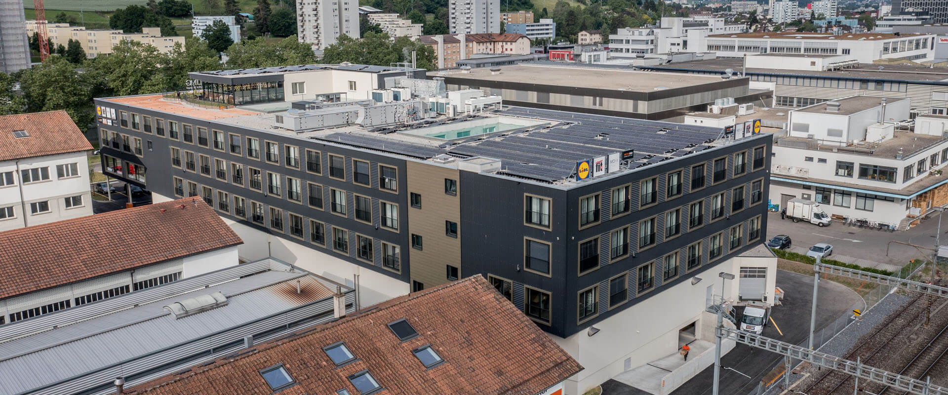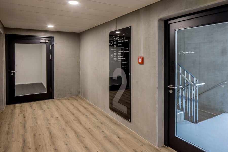 Viergeschossiges Gewerbehaus mit Tiefgarage, Lichthöfen und Dachterrasse. Der Nutzungs-Mix umfasst Büroflächen, ein Fitnesscenter, eine Lidl-Filiale sowie Business Appartements (122 Zimmer).