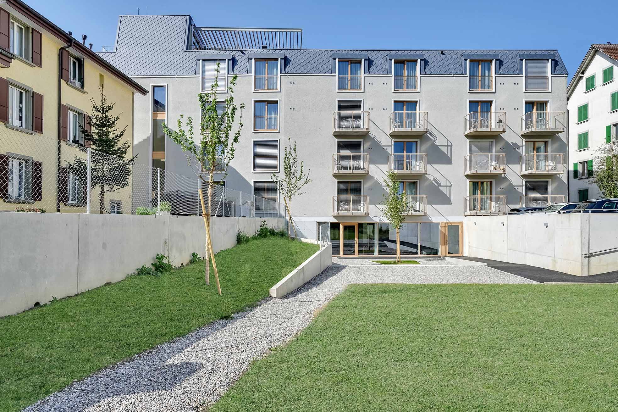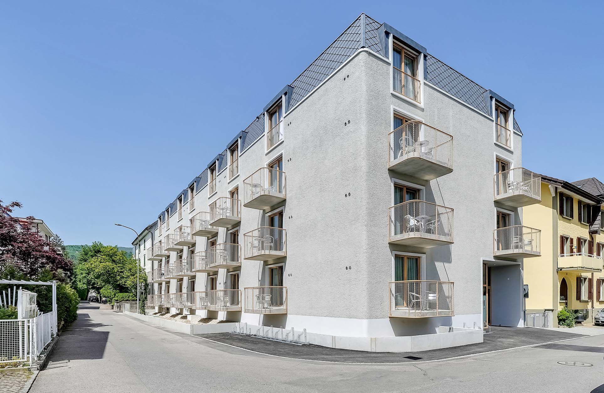 Wie bei allen MOOI-Projekten übernahm die METHABAU die Gesamtverantwortung für Konzeption und Umsetzung. Für den viergeschossigen Neubau mit rund 1’600 m² Bruttogeschossfläche setzte die METHABAU für eine effiziente und wirtschaftliche Bauweise – wo immer möglich – Fertigelemente ein. Zunächst erfolgte der Abbruch des Altbaus sowie die fachgerechte Sanierung und Entsorgung der Altlasten. Die beengte Baustellensituation erforderte Materiallieferungen im Einbahnverkehr und zeitweise Strassensperrungen. METHABAU realisierte auch hier die Decken in Ortbeton und errichtete die Aussenwände entweder in Backstein oder mit vorgefertigten Elementen. Die Wohnungstrennwände bestehen aus Ortbeton, nicht tragende Innenwände wurden in Trockenbauweise realisiert. Das Mansardendach mit Lukarnen wurde in Holzelementbauweise errichtet und mit einer schuppenartigen Blecheindeckung versehen, während die Dachrandelemente aus Glasfaserbeton bestehen. Jedes Apartment verfügt über ein dezentrales Lüftungssystem. Der Strom für das Gebäude wird über eine hauseigene Photovoltaikanlage auf dem Dach erzeugt, während die Beheizung über eine Wärmepumpe in Kombination mit Erdsonden erfolgt.