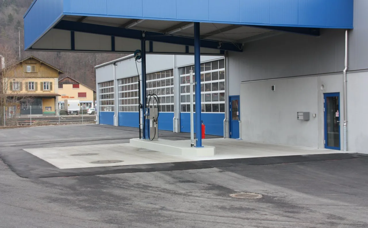 Busdepot mit Einstellhalle, Waschanlage für Grossfahrzeuge, Reparaturwerkstatt und den dazugehörigen Sozialräumen