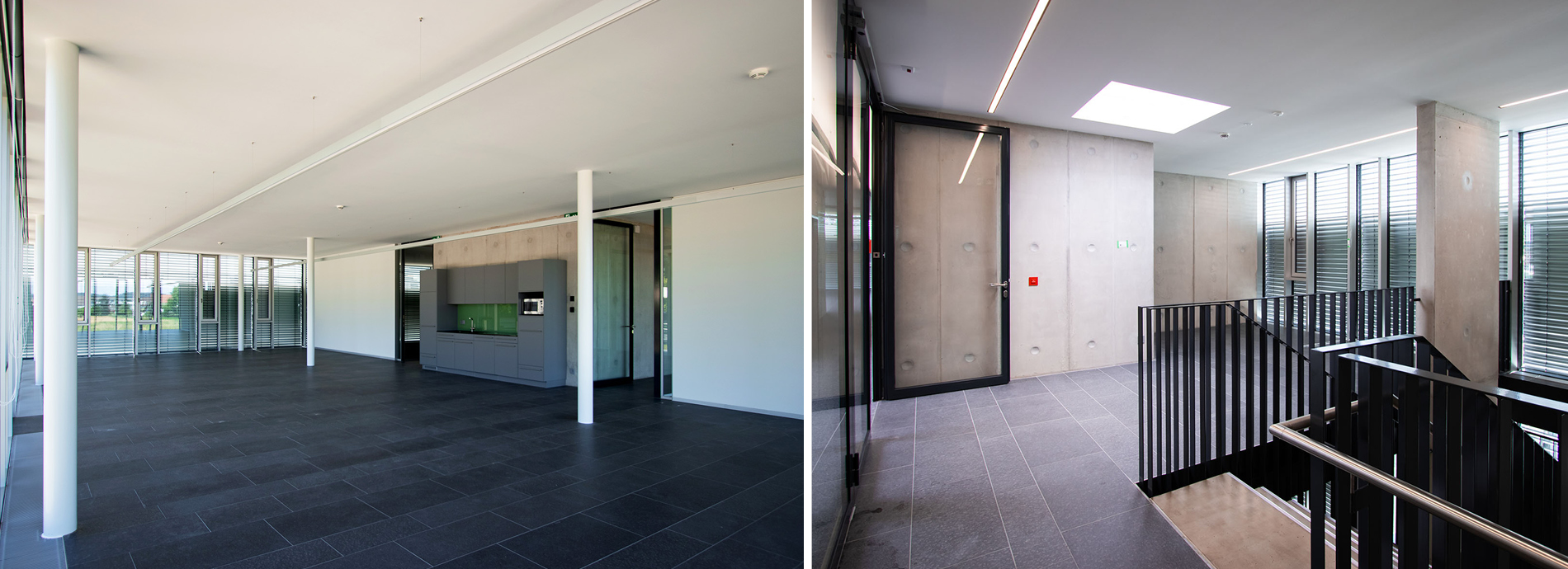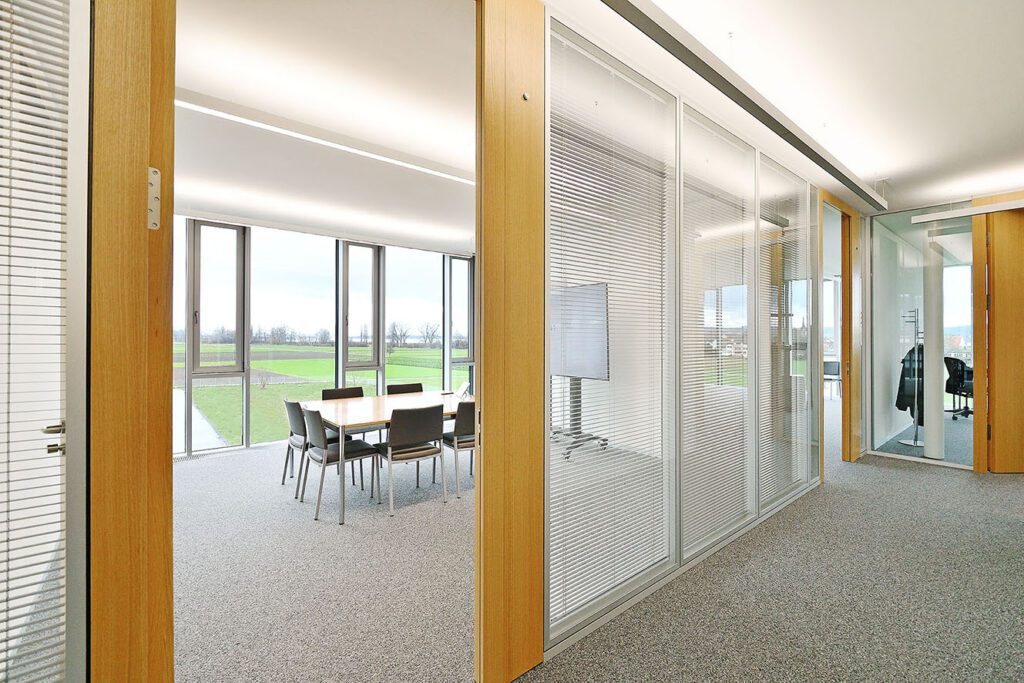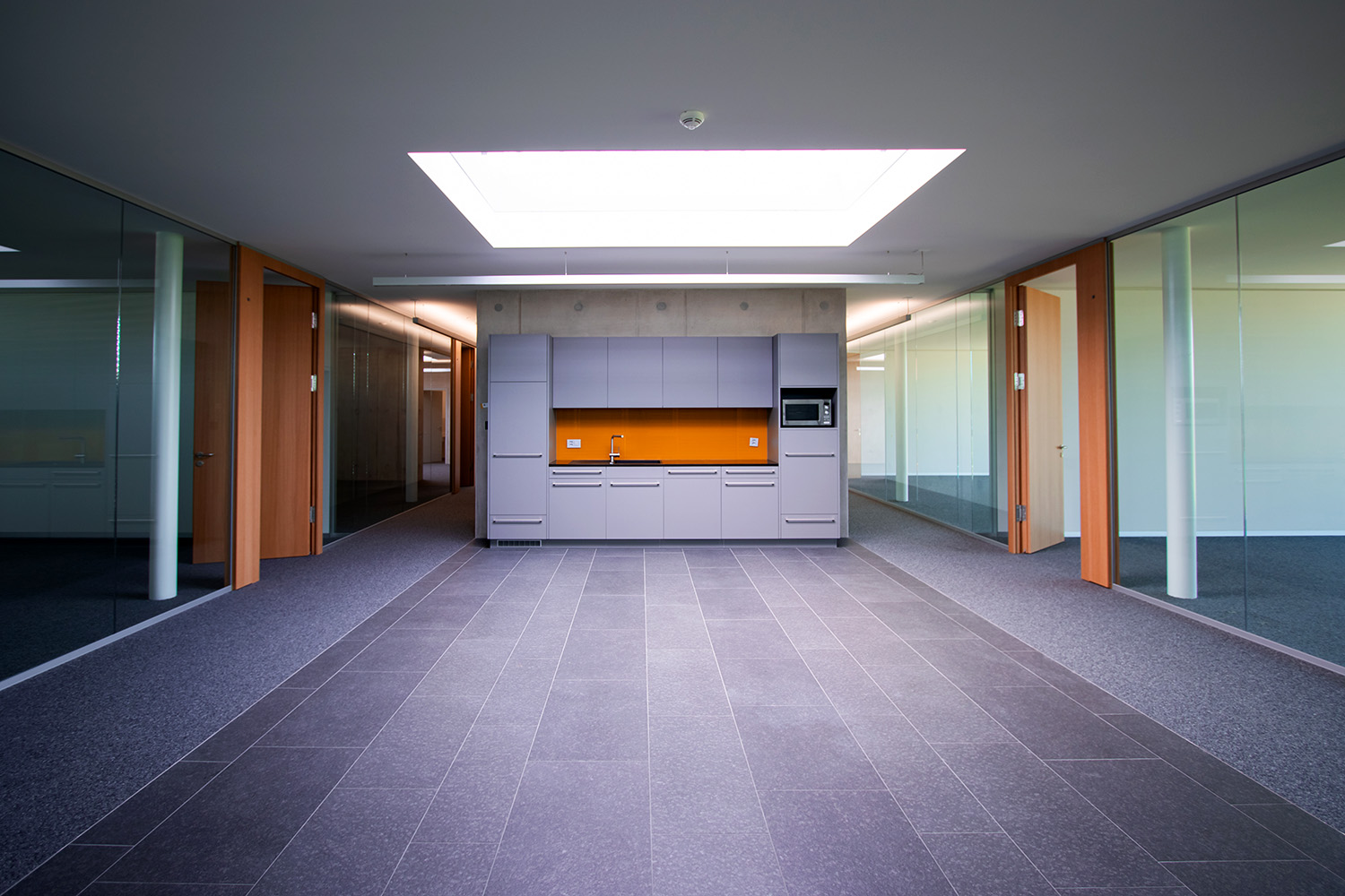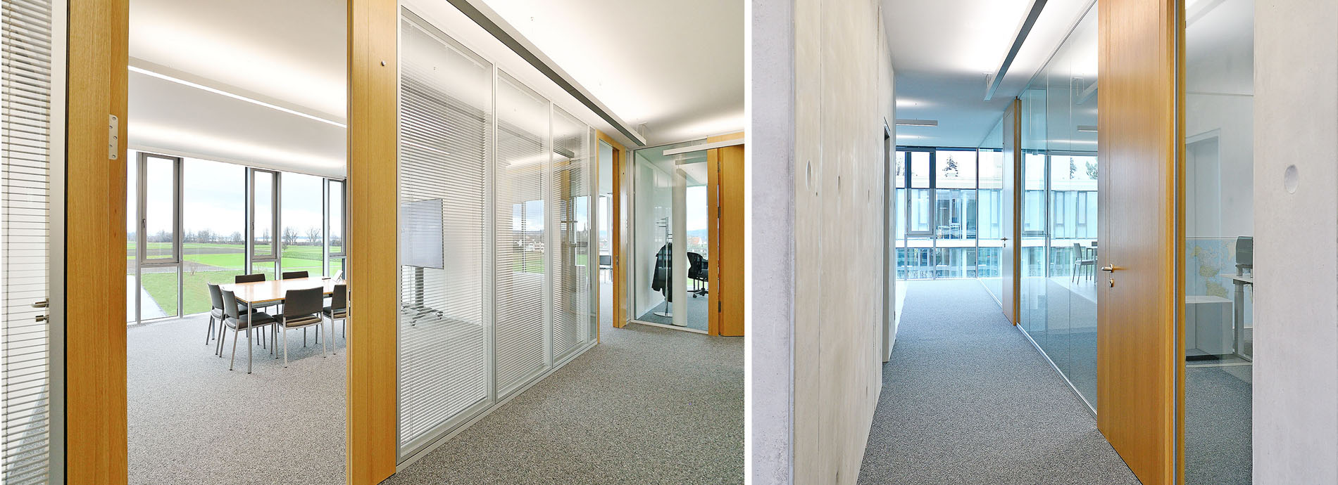 Doch hinter den Fassaden steckt mehr: Die ambitionierte, progressiv-moderne Architektur mit technisch anspruchsvollen Detaillierungen setzt sich auch im Inneren fort. Neben dem Erschliessungskern aus Sichtbeton prägen die raumhohen Bürotrennwände komplett aus Glas sowie die ebenfalls raumhohen Türen aus Massivholz das Innenleben des Neubaus.